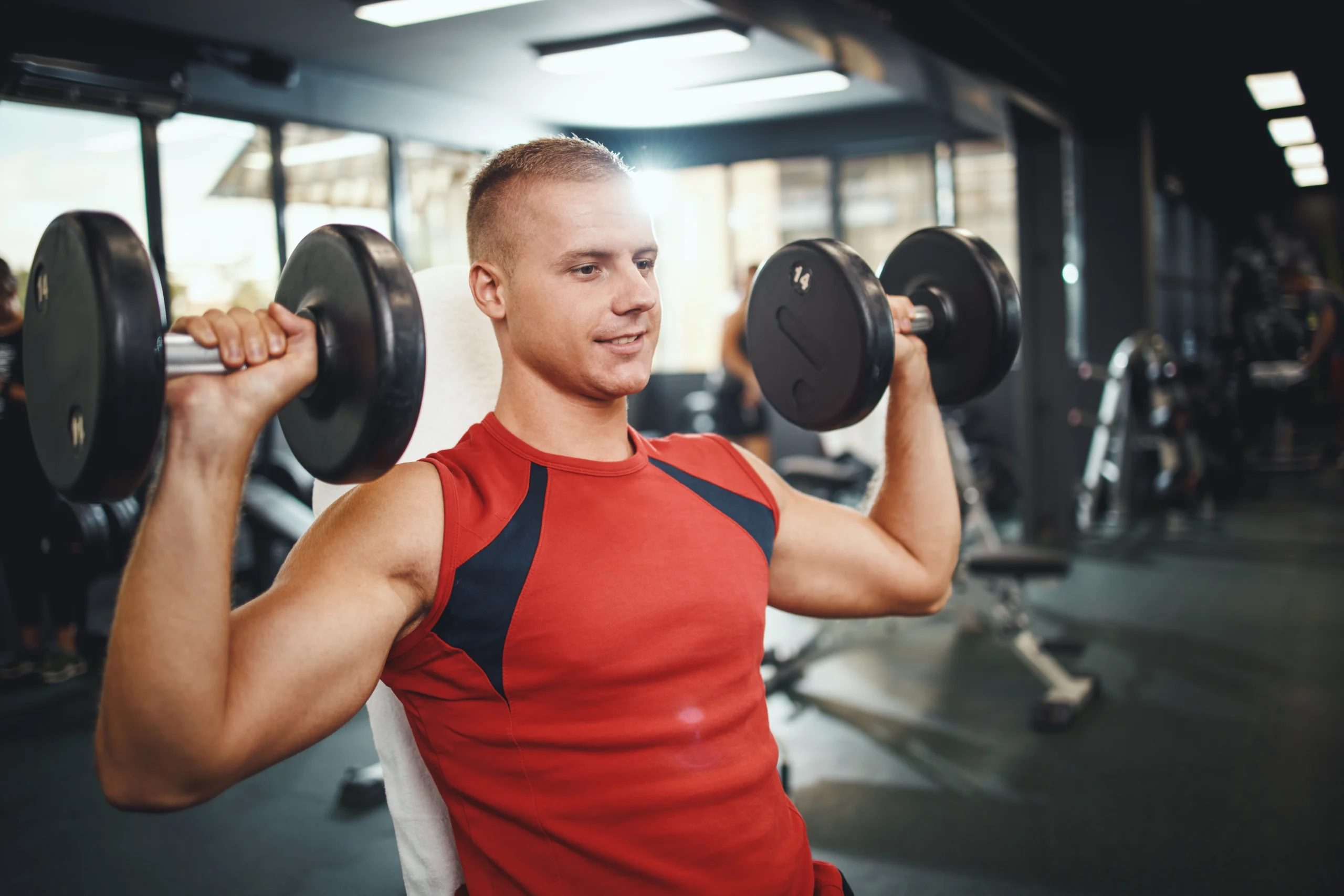 1. Shoulder Press: With a dumbbell in each hand, make a “field goal ” shape with your arms: your arms are bent at a 90-degree angle with your palms facing up. Brace your core as you press the weights overhead, then slowly lower them back down to your starting position.